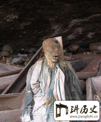 导读:棺葬式是一种处置死者尸骨的特殊方式,在我国主要分布于古代南方少数民族地区。对这种富有深厚文化涵容的悬棺葬式,存在着许多令今人无法解释的困惑之处。比如,远古时代的人们到底是用什么办法把装有尸体和随葬物品、重达数百公斤的棺木送进高高的崖洞里去的,就是一个令人“难捉摸”的问题。下面我们来通过崖葬悬棺中的惊悚干尸揭秘悬棺的悬法和产生的历史过程: